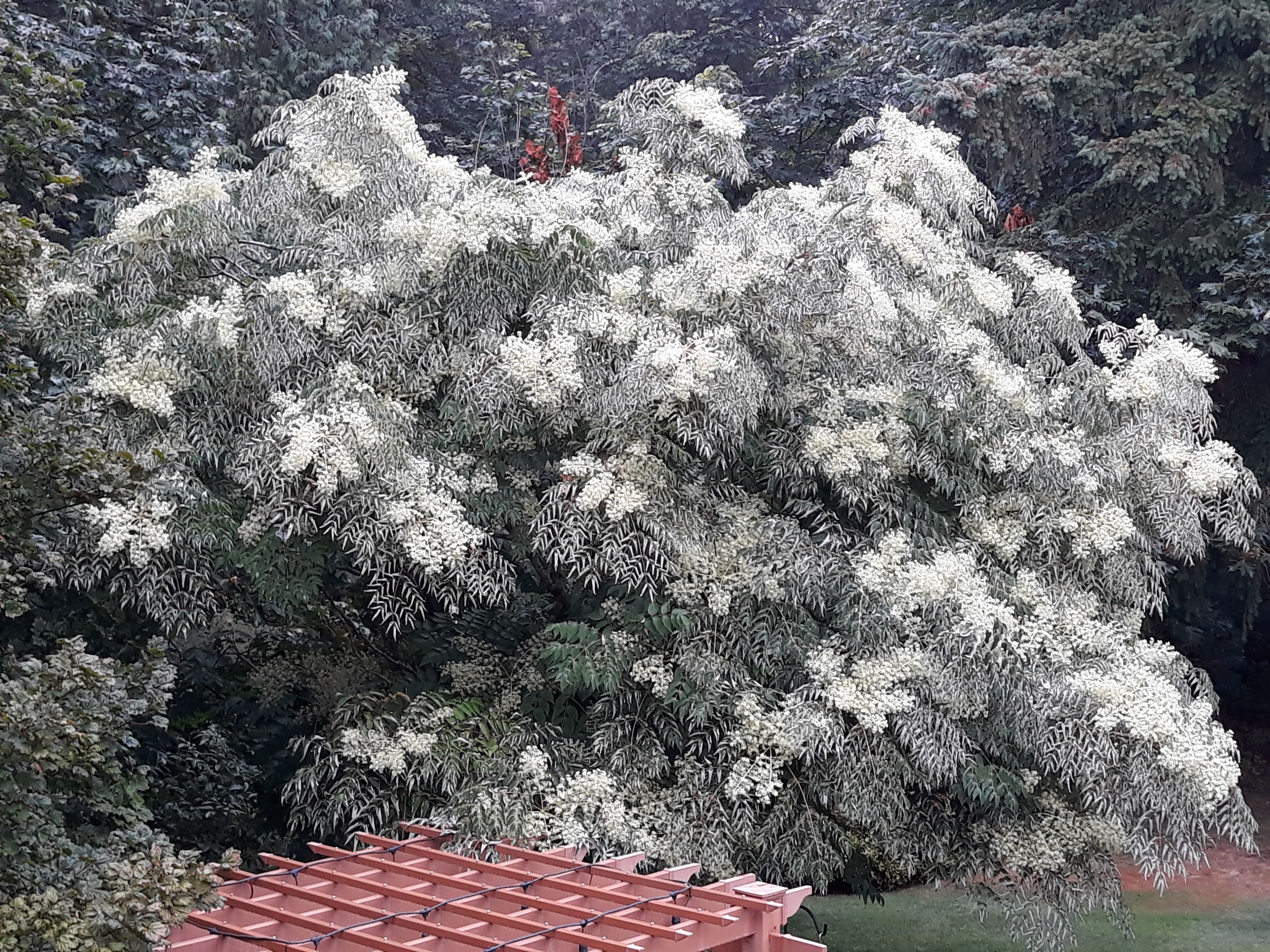 The first day of rain in over a month and this is what I look out to. I don’t think this tree has ever been wet when in full bloom. Usually it is green-leaved with a light green almost white blossoms – and covered in bees – not this white cloud. I just thought it was really pretty and wanted to share.